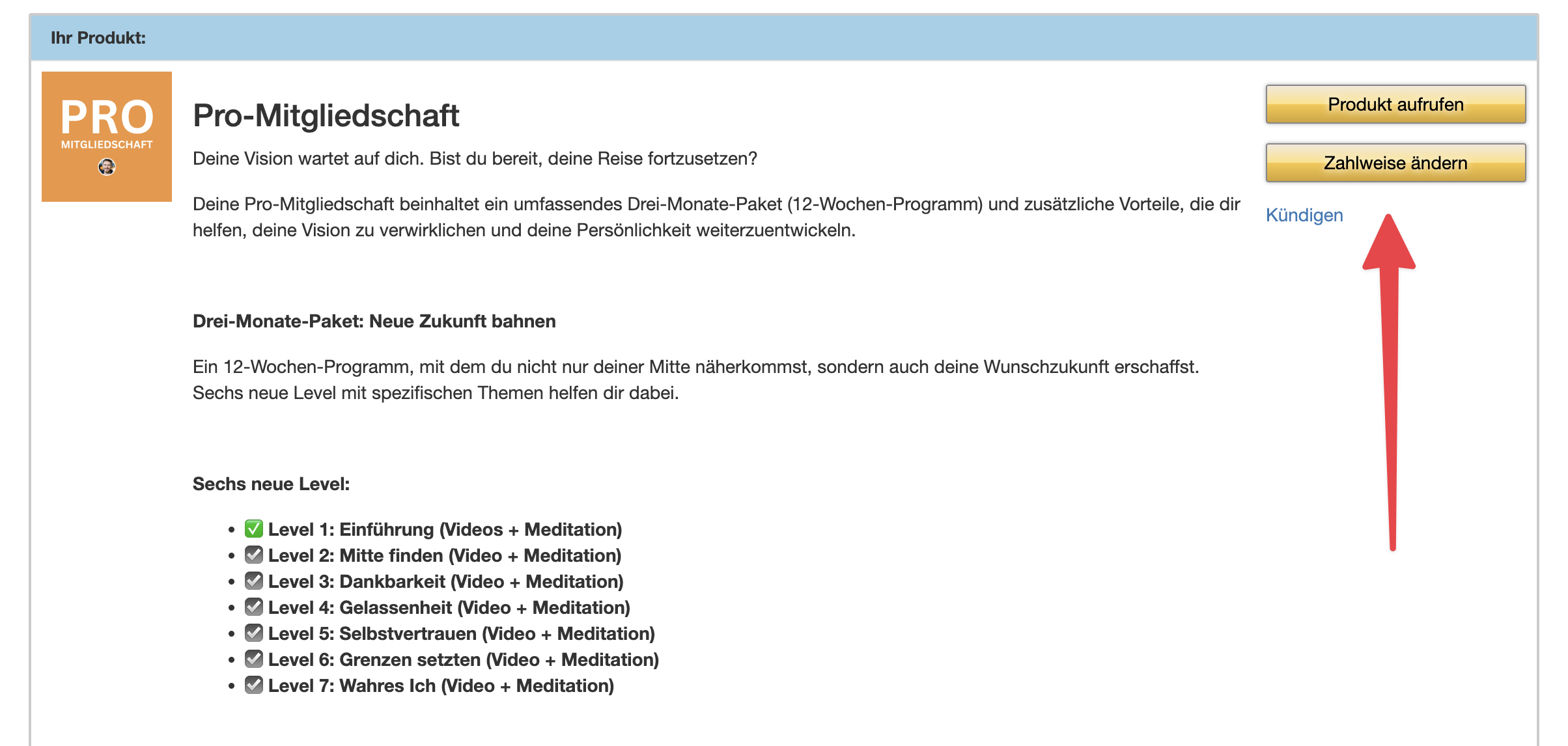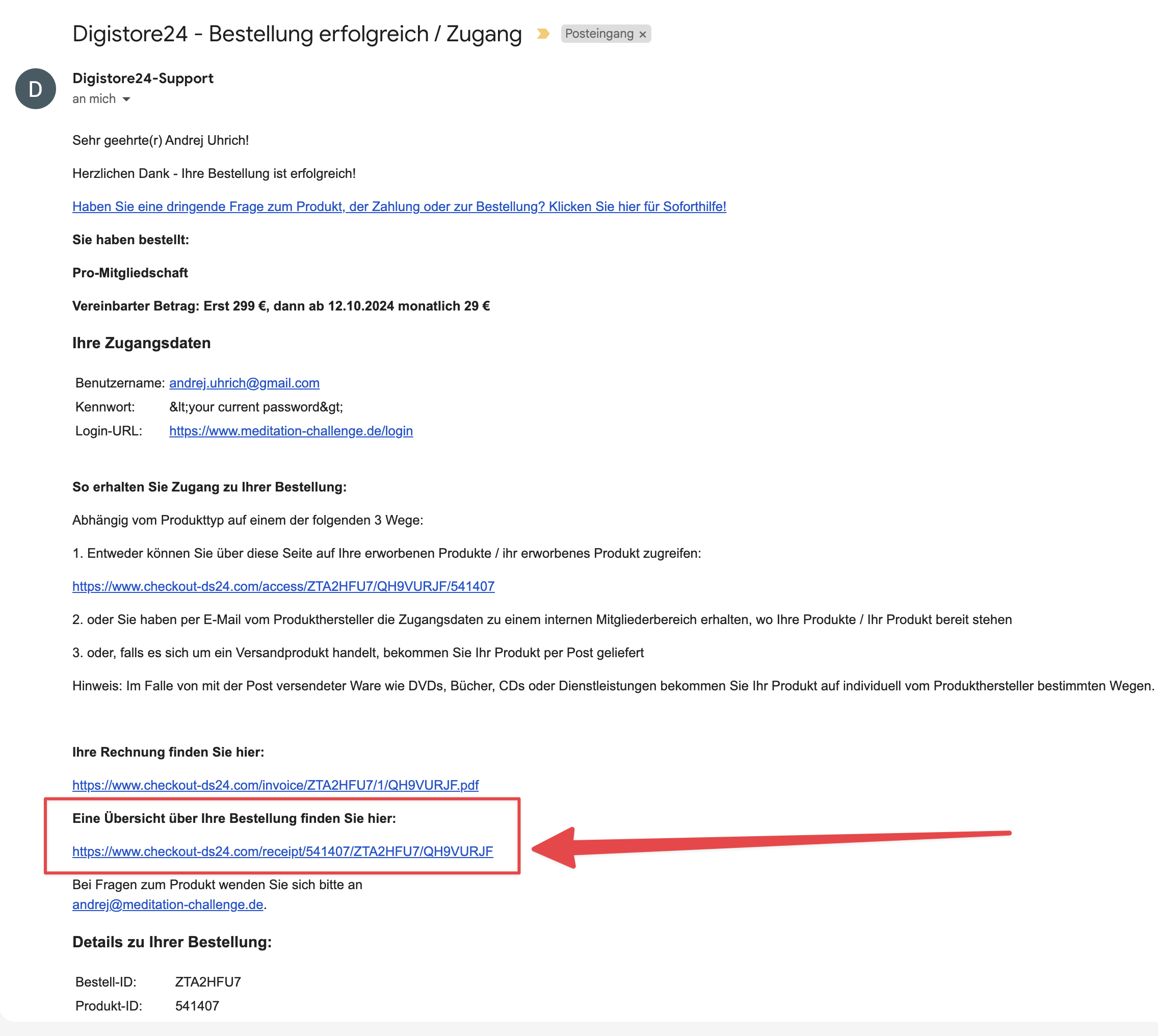 Die Änderung der Zahlweise erfolgt über die Bestellbestätigungsseite. Nach deiner Bestellung der Pro-Mitgliedschaft erhältst du eine Bestellbestätigungsmail mit dem folgenden Betreff: Digistore24 - Bestellung erfolgreich / Zugang