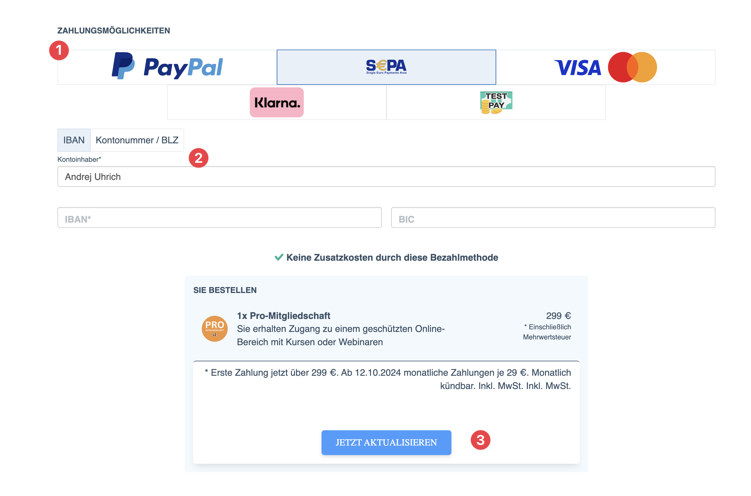 (1) Wähle danach deine neue Zahlweise. (2) Gib die notwendigen Informationen an. (3) Klicke auf aktualisieren.
