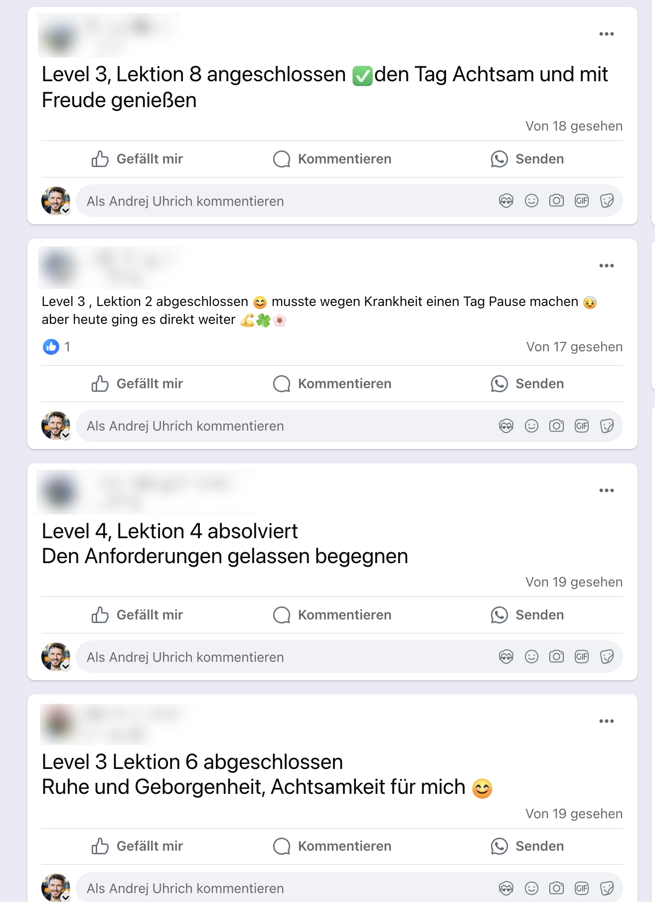 Du bist Teil unserer Pro-Gemeinschaft und absolvierst regelmäßig (eventuell täglich) eine Lektion. Egal, ob du die einzelnen Lektionen via Browser oder App erledigst, am Ende hast du die Möglichkeit, deinen Fortschritt mit anderen Herzensmenschen zu teilen.