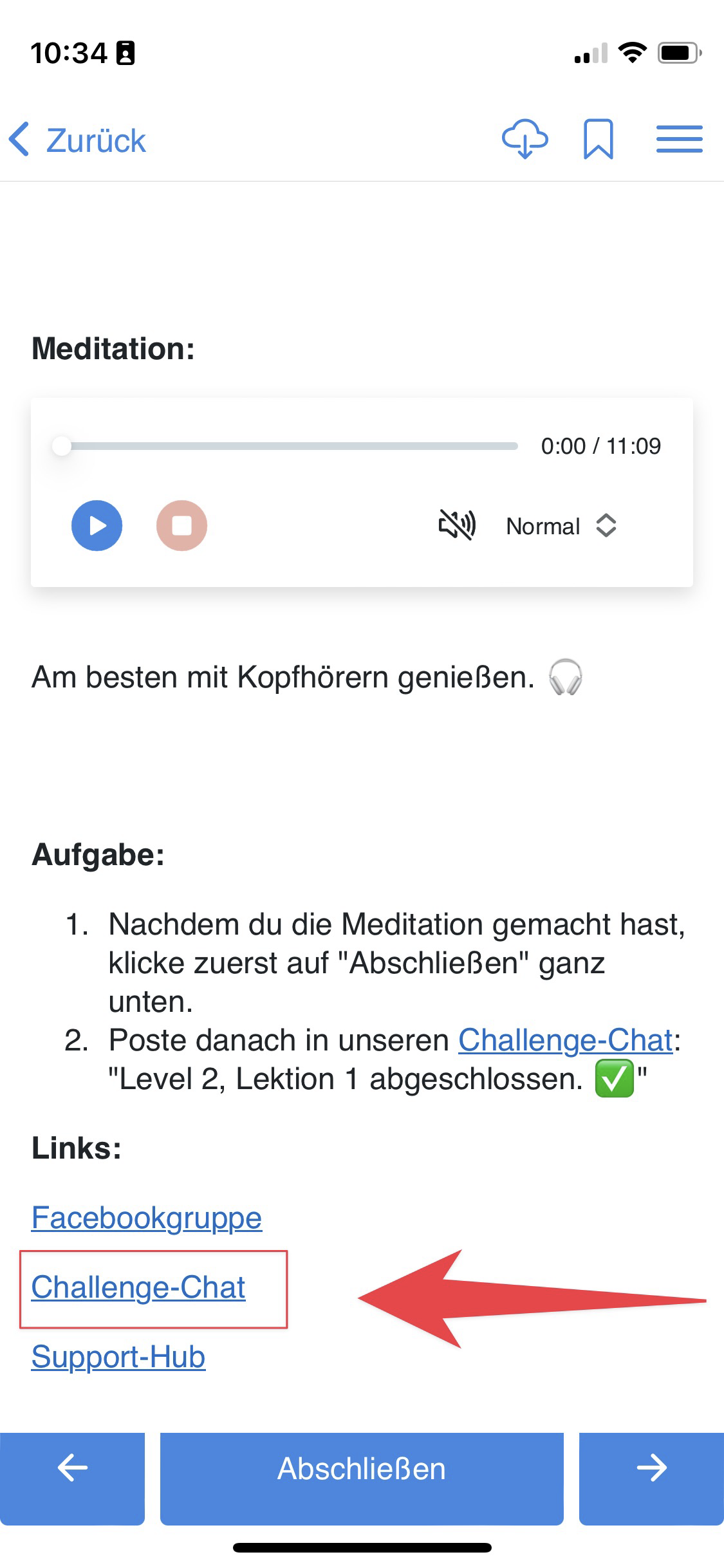 Nachdem du eine Lektion via Browser oder App absolviert hast, gibt es eine Möglichkeit deinen Fortschritt im Challenge-Chat zu teilen. Die Verlinkung dazu findest du in der Lektion ganz unten.