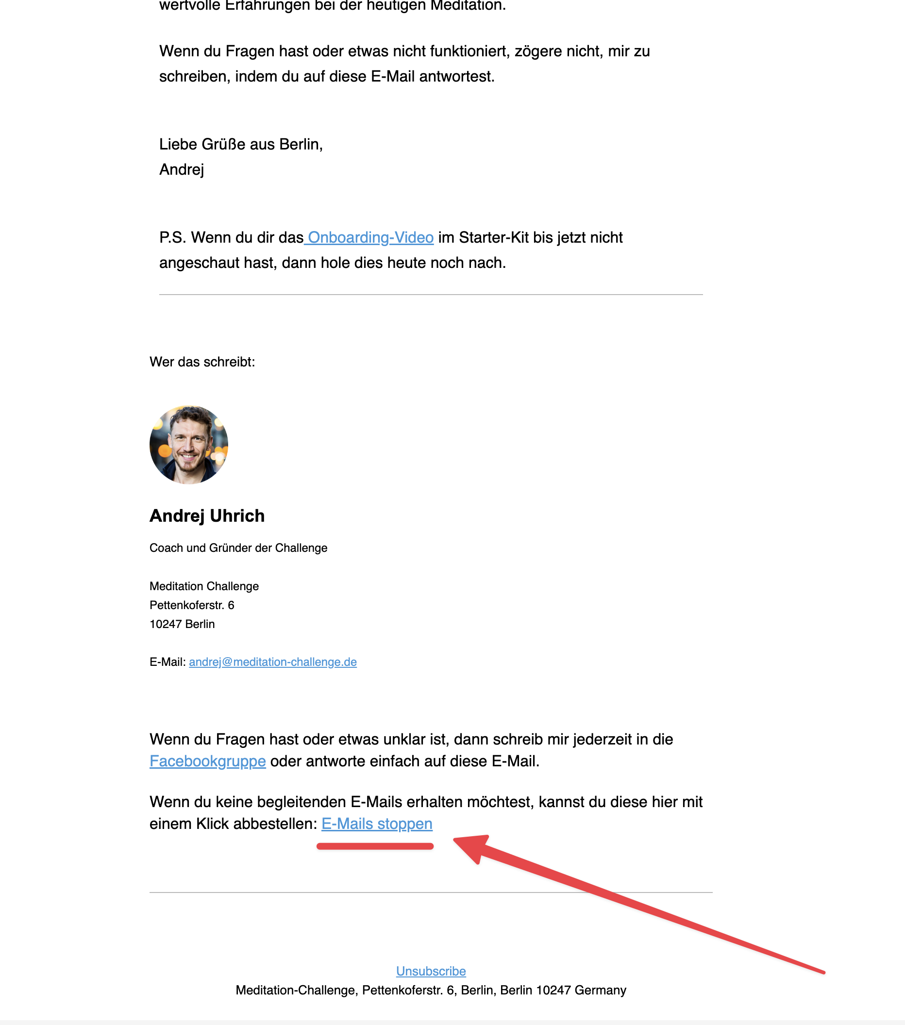 - Schritt: Klicke ganz unten in der begleitenden E-Mail auf "E-Mail stoppen" (siehe Bild). Diese E-Mail hat meistens einen Betreff, der ungefähr so aussieht: "🧘♂️ Woche 1, Tag 1: ...."