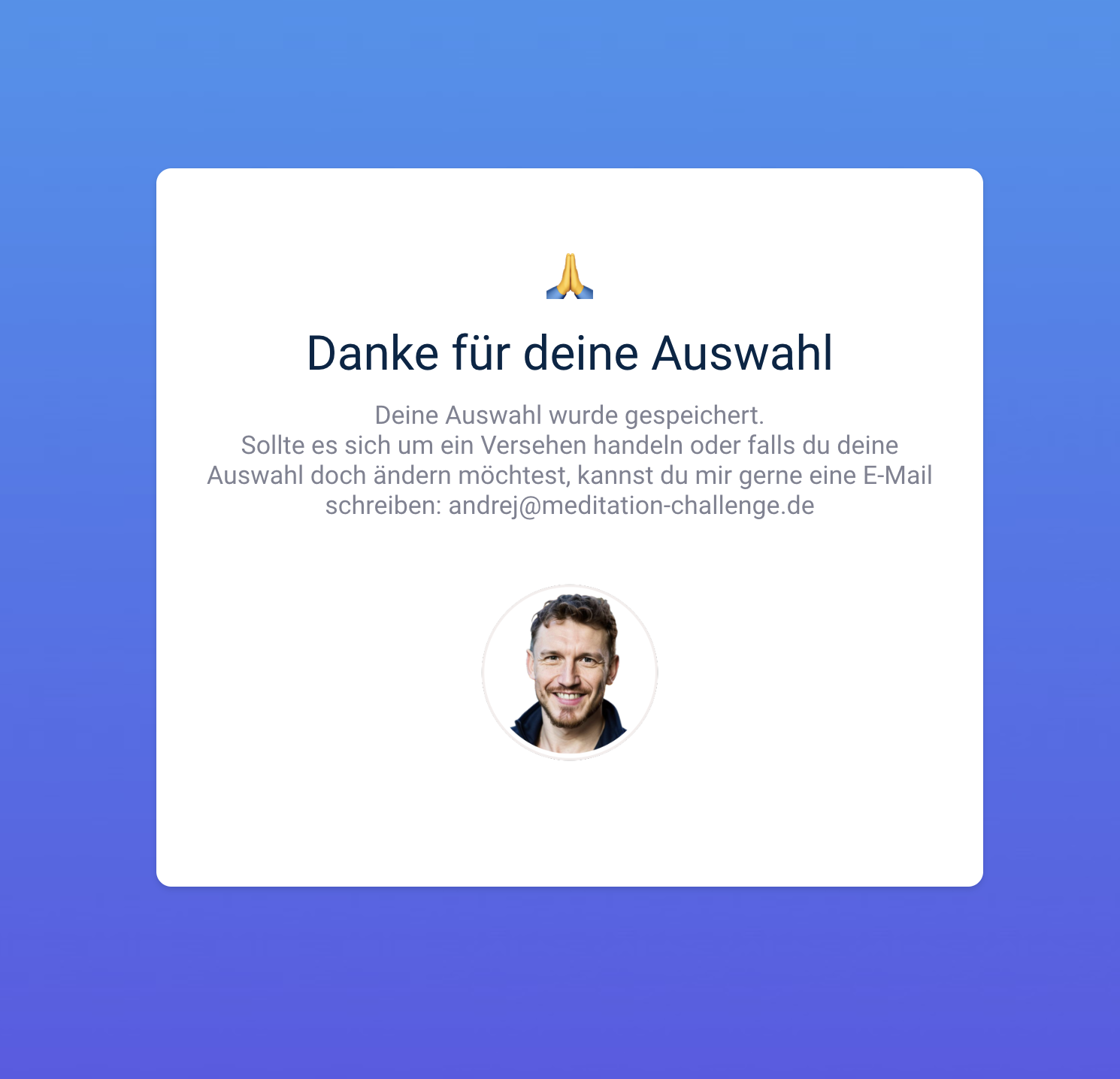 Du bist damit nicht aus dem Verteiler ausgeschrieben. Du erhältst von mir weiterhin Einladungen zu zukünftigen Challenges. So kannst du zu einem späteren Zeitpunkt teilnehmen. Du kannst dich natürlich auch über diese Seite anmelden. Die Anmeldung ist meistens nur am Samstag und Sonntag möglich: https://www.meditation-challenge.de/