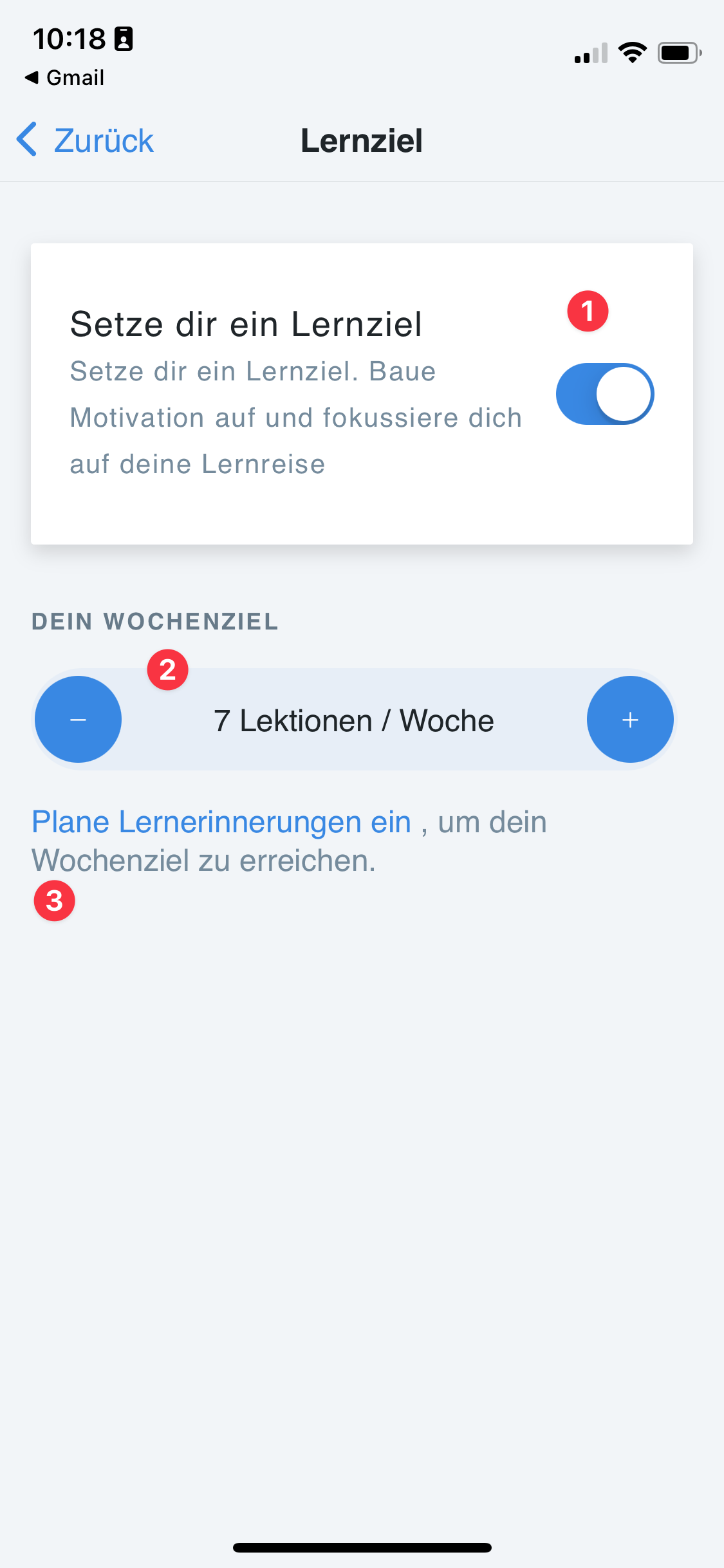 - Schritt: (1) Schalte hier die Lernziele ein. (2) Setze dein Wochenziel auf "7 Lektionen pro Woche". (3) Klicke dann auf "Plane Lernerinnerungen ein"