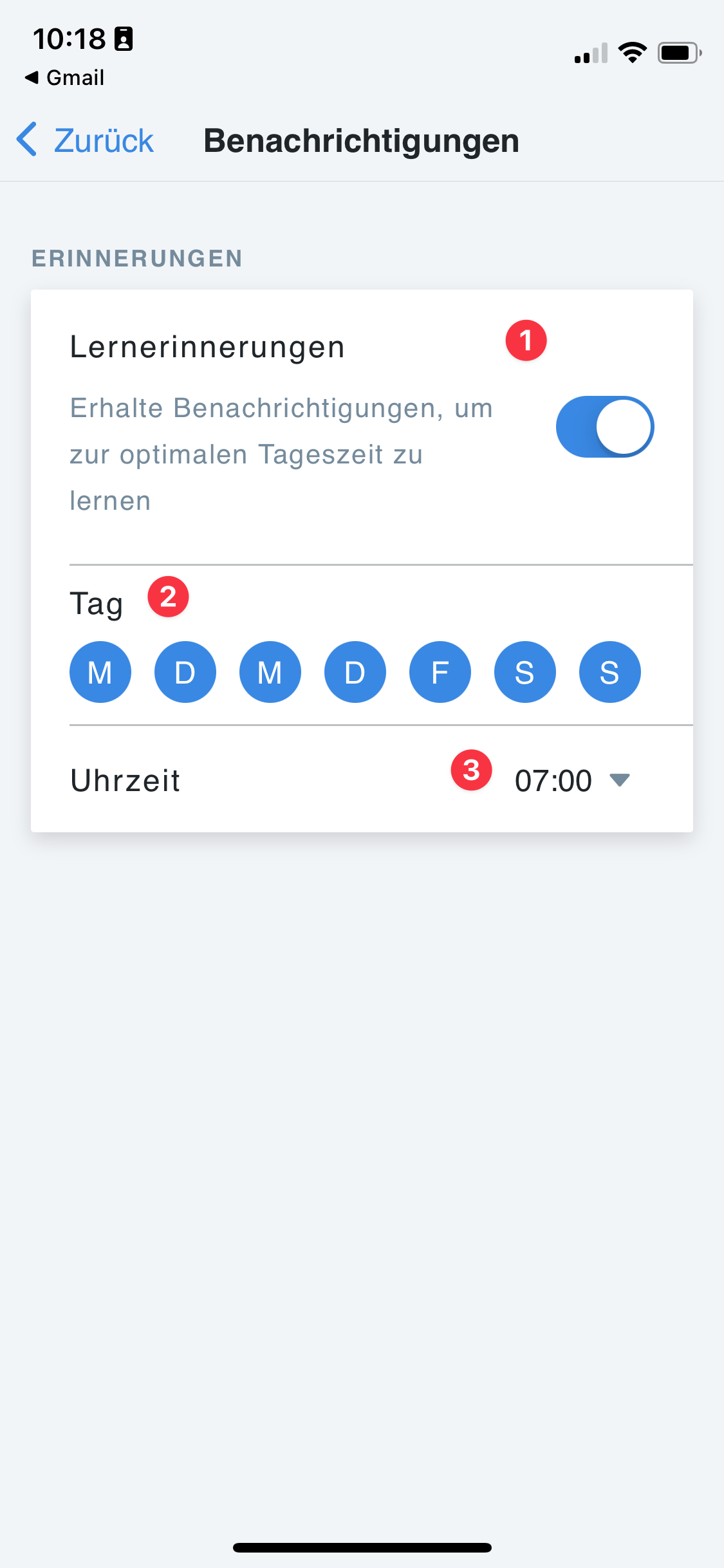 - Schritt: (1) Sobald du auf der Seite für "Benachrichtigungen" bist, schalte zuerst die Erinnerungen / Lernerinnerungen ein. (2) Schalte danach die Erinnerungen für jeden Wochentag ein und (3) setze die passende Uhrzeit. Um diese Zeit erhältst du die Erinnerung. Idealerweise sollte dies kurz vor dem täglichen Meditieren sein.