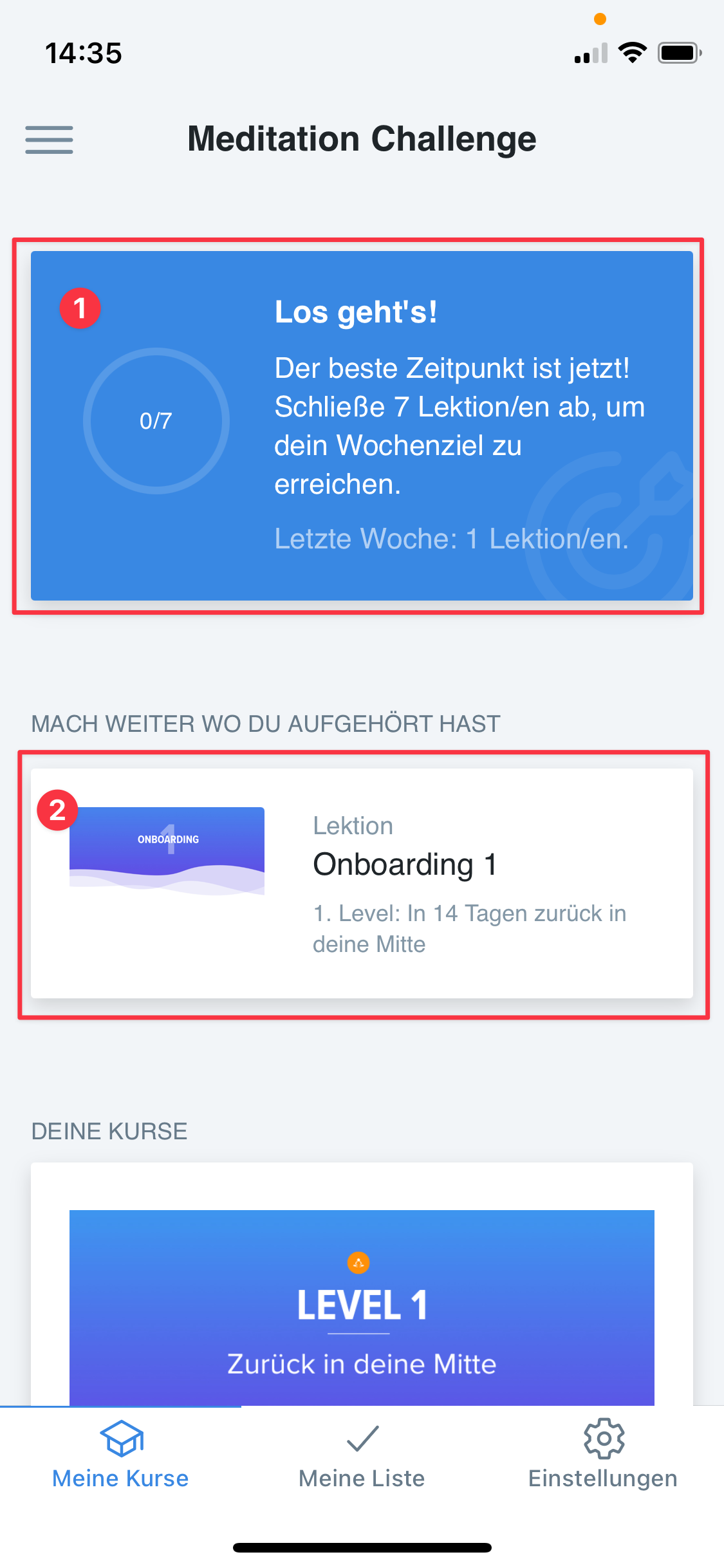 - Schritt: Du kommst jetzt in die App und müsstest das vor dir sehen. (1) Es zeigt dir an, wie viele Lektionen du noch machen musst, um dein Lernziel zu absolvieren. (2) Hier wartet die nächste Lektion auf dich.